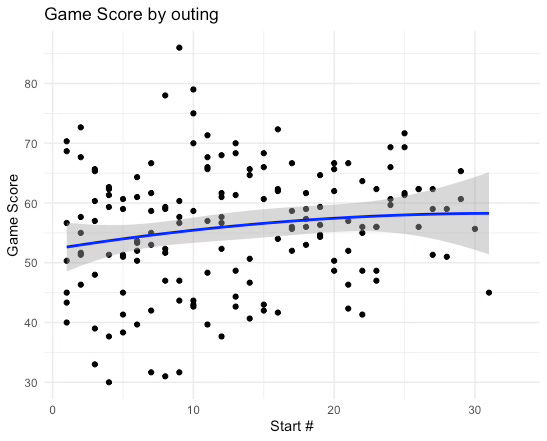 Castillo might also pitch worse to begin the season regardless of weather. In fact, there’s a statistically significant relationship when just looking at the outing number and game score.