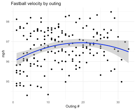 I won’t send you home empty handed, however, as I did find one statistically significant result. Castillo’s average fastball velocity consistently and reliably goes up with each outing within a season (and then it tends to go back down towards the end).