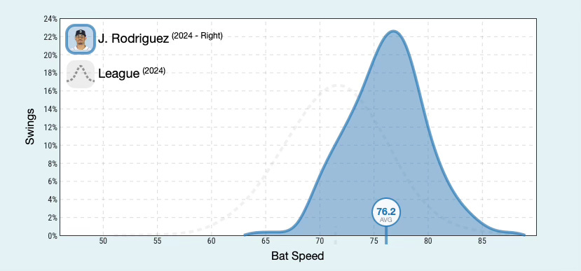 Mitch Garver has a roughly average bat speed at 71 mph. Thatâs notable because people (including myself) have speculated that his swing is slower now as a way to explain his early struggles.1 We canât know for sure, however, as the data only includes bat speed for 2024. One other note is that Garverâs fast swing rate (>= 75 mph) is about 10%, which is bottom third of the league. Iâm not sure how much that matters.